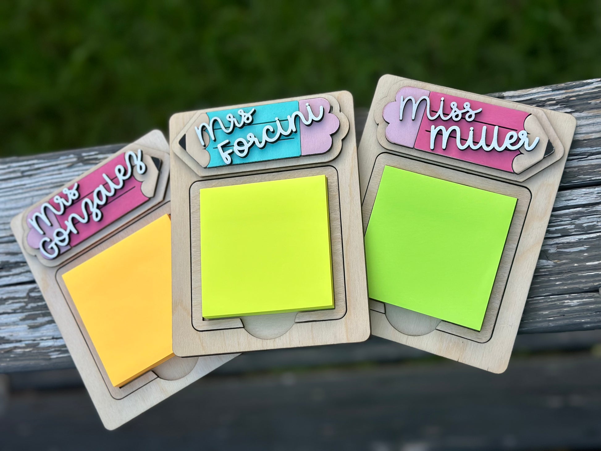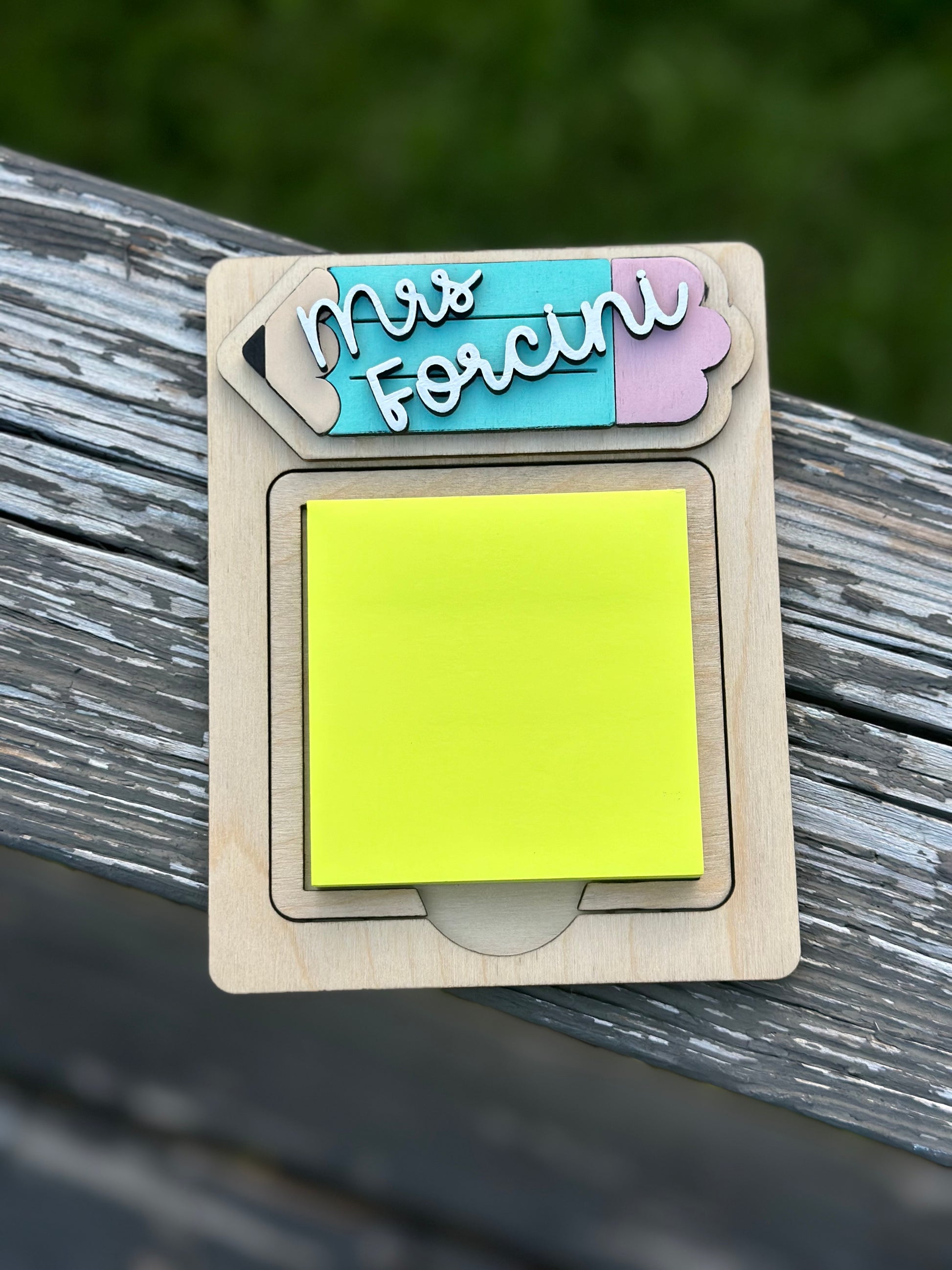 Made from birch wood and hand painted, comes with one random color sticky note pad. Fits 3x3 sticky notes.
