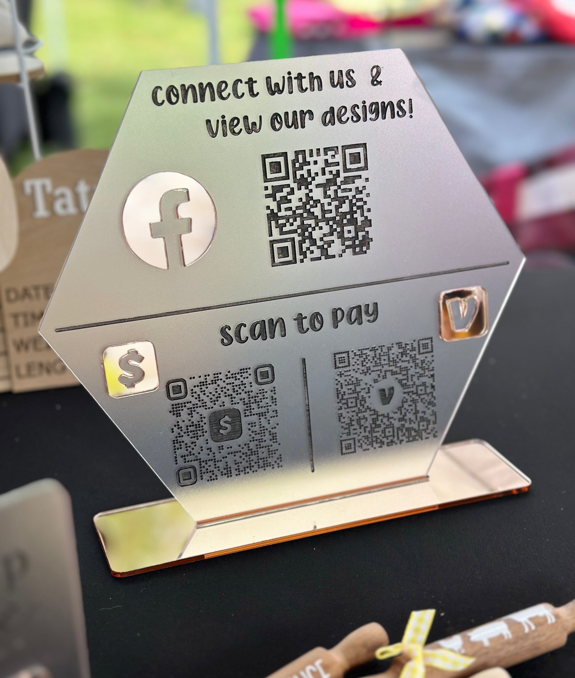 Acrylic cut and engraved signs for your QR codes! Perfect for small businesses to accept payment, display your website, etc!